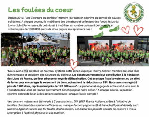 “Nous avons mis en place un nouveau système cette année, explique Thierry Andrier, membre du Lions club d’Annemasse et président des Coureurs du bonheur. Les donateurs versent leur contribution à la Fondation des Lions de France, qui leur adresse un reçu de défiscalisation. Cet avantage fiscal a vraiment eu un effet de levier pour encourager le versement de dons, notamment la réduction sur l’IFI. Nous avons enregistré plus de 1200 dons, représentant près de 120 000 euros*. Le partenariat engagé de notre club Lions avec la Fondation des Lions de France est vraiment bénéfique pour notre action.”